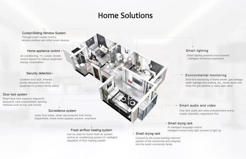 Focus on the whole house LoRa wireless intelligence, to be a smart home brand that ordinary people can afford and useDozens of smart devices such as smart door locks, smart lighting, smart curtains, smart audio and video, smart security, etc. constitute a complete smart home system